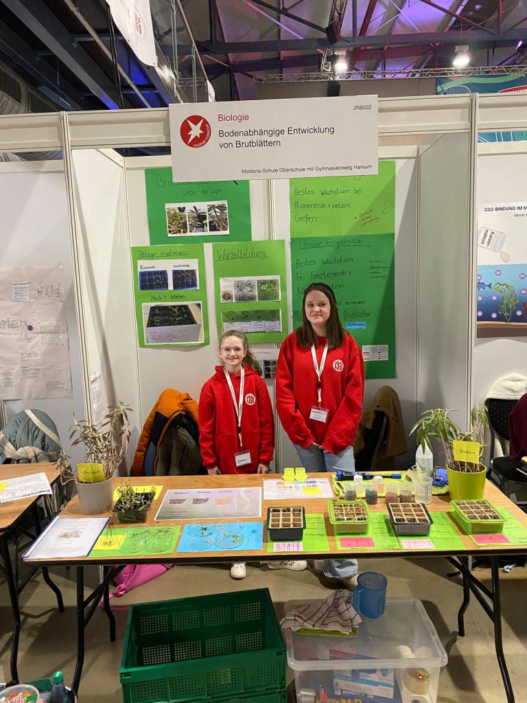 Isabella (R6b) und Pia (R5b) untersuchten die bodenabhängige Entwicklung von Brutblättern. Brutblätter sind besondere Pflanzen, an deren Blatträndern kleine neue Pflänzchen wachsen, die später abfallen und selbstständig weiterwachsen können. Die beiden erforschten, wie sich unterschiedliche Böden, etwa Gartenerde oder Sand, sowie verschiedene Gießmengen auf das Wachstum auswirken.