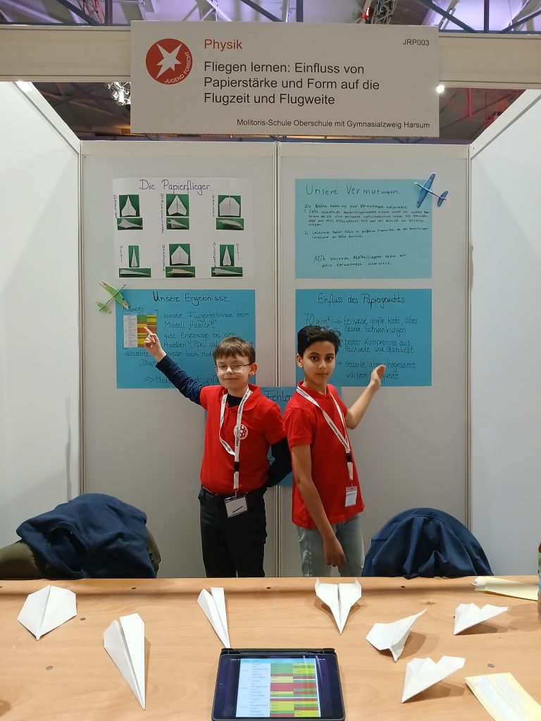 Henry (R5c) und Carlos (G5a) beschäftigten sich mit Papierfliegern. In ihrem Projekt „Fliegen lernen“ gingen sie der Frage nach, welchen Einfluss Papierstärke und Form auf Flugzeit und Flugweite haben. Dafür wurden zahlreiche Modelle gefaltet, getestet und immer wieder verbessert.