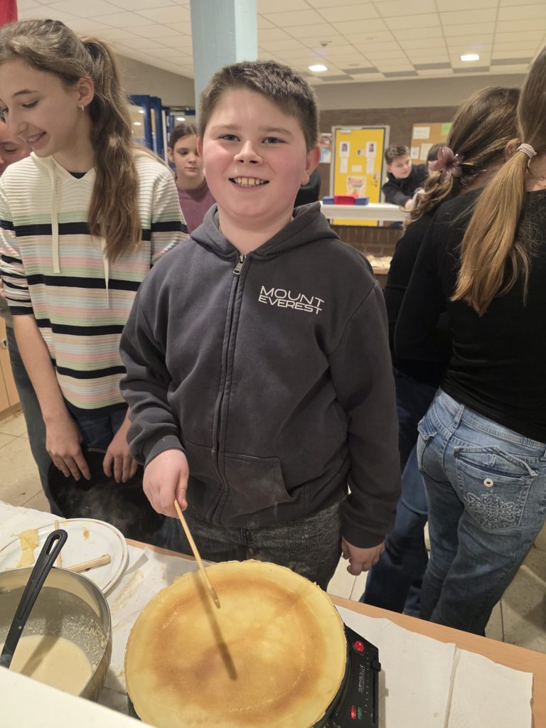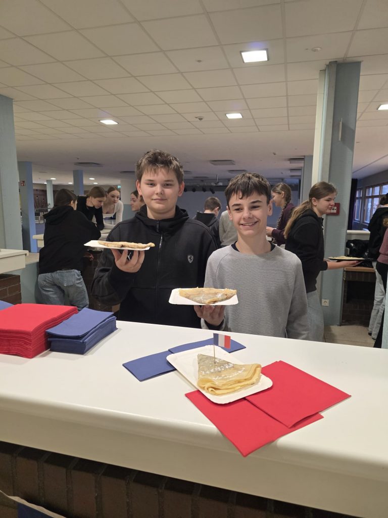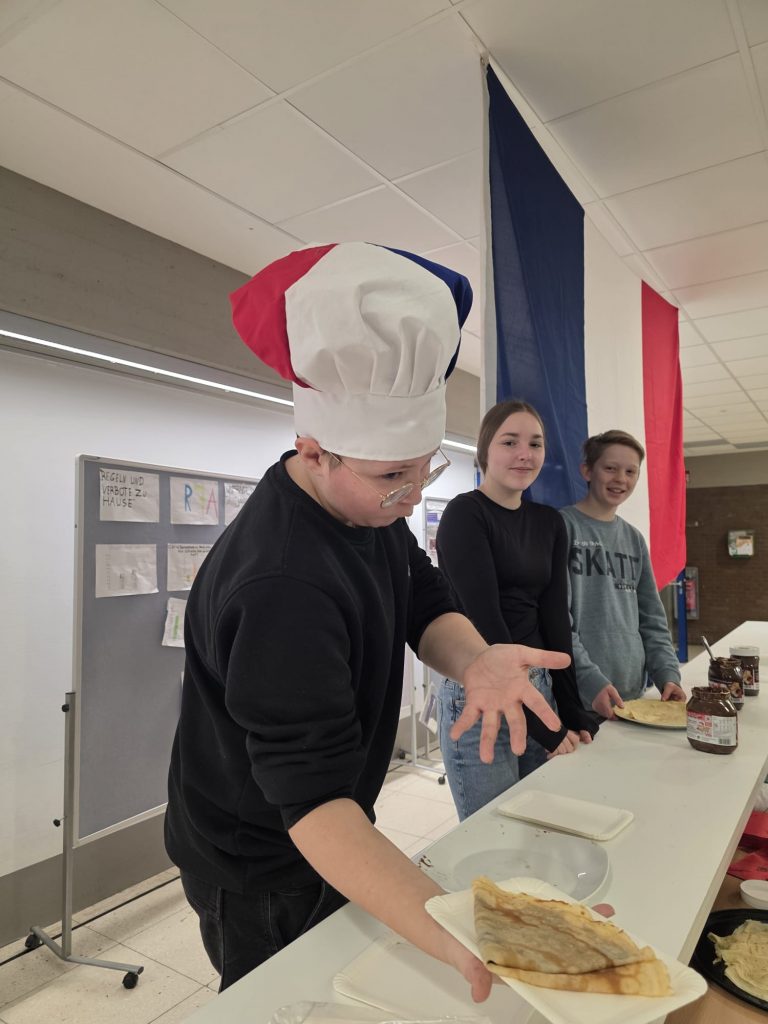 Genau das hat die Klasse G7 unter der Leitung von Frau Fröhlich eindrucksvoll umgesetzt: In der ersten großen Pause organisierte die Klasse einen Crêpestand, an dem rund 150 Crêpes mit Nutella verkauft wurden. Der Duft frisch gebackener Crêpes sorgte schnell für gute Laune und eine lange Schlange – die Aktion war ein voller Erfolg.