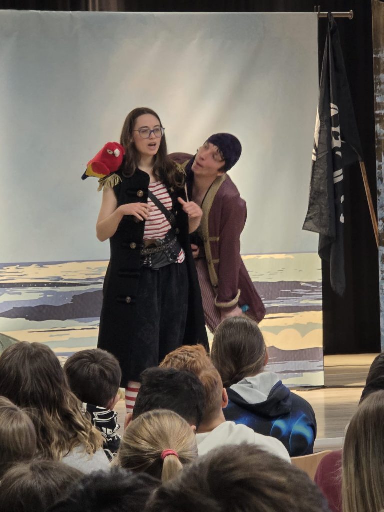 Für die Jahrgänge 5 bis 7 wurde das Stück „The Tiger of the Seas“ aufgeführt. Die Piratengeschichte über einen entführten Jungen und seine Freundin Jenny war spannend und lustig zugleich. Besonders viel Spaß machte es, dass das Publikum immer wieder mitmachen durfte: Mit Handbewegungen wurden Wellen dargestellt, mit Geräuschen Schafe nachgeahmt. Für großes Gelächter sorgte der Moment, als Herr Mohwinkel, Fachschaftsleiter Englisch, von den Piraten „entführt“ und auf die Bühne geholt wurde.