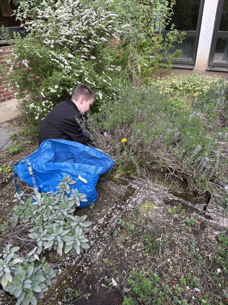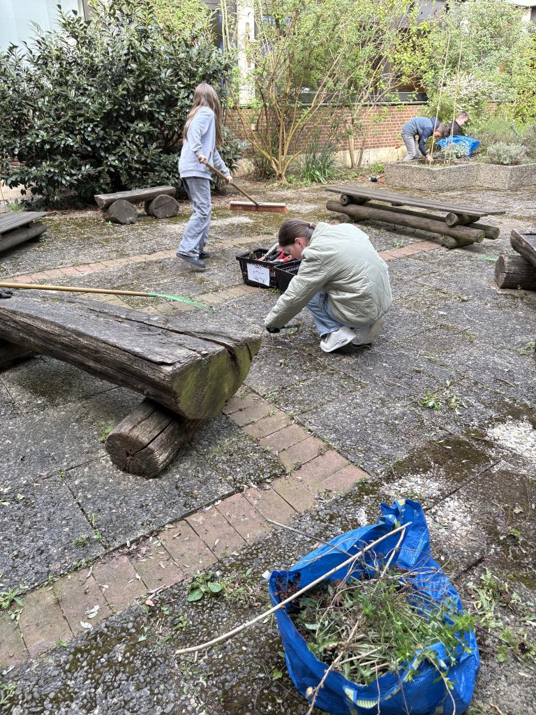 Der WPK Kräutergarten von Frau Ahrens, Frau Kolberg und Herrn Böhm ist wieder aktiv: Gemeinsam wie der Innenhof auf Vordermann gebracht. Es wird gepflanzt, gepflegt und gebaut. Neue Insektenhotels entstehen, die künftig vielen kleinen Nützlingen ein Zuhause bieten.